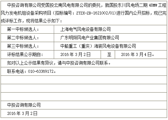 国投云南风电有限公司国投东川风电场二期48MW工程风力发电机组设备采购项目中标候选人公示