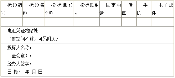 第二步:投标人将购买招标文件回执确认单(可复制的word文档和扫描件,格式见附表)和汇款底单(扫描)发送至chenhaigang@chdt.com.cn邮箱中(电子邮件和发送的文件主题栏需填写“四海萍道路招标+****公司购买标书文件”)。