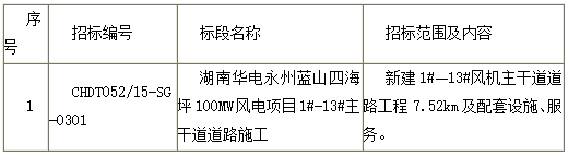 华电招标有限公司受中国华电集团湖南分公司委托,作为其招标代理机构,对湖南华电永州蓝山四海坪100MW风电项目1#-13#风机主干道道路施工等相关服务进行国内公开招标,现公告(变更)如下: