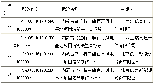 中国电力投资集团公司物资装备分公司2016年第一批风电塔筒集中招标(乌拉特百万风电基地塔筒、法兰)招标结果公示