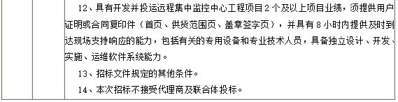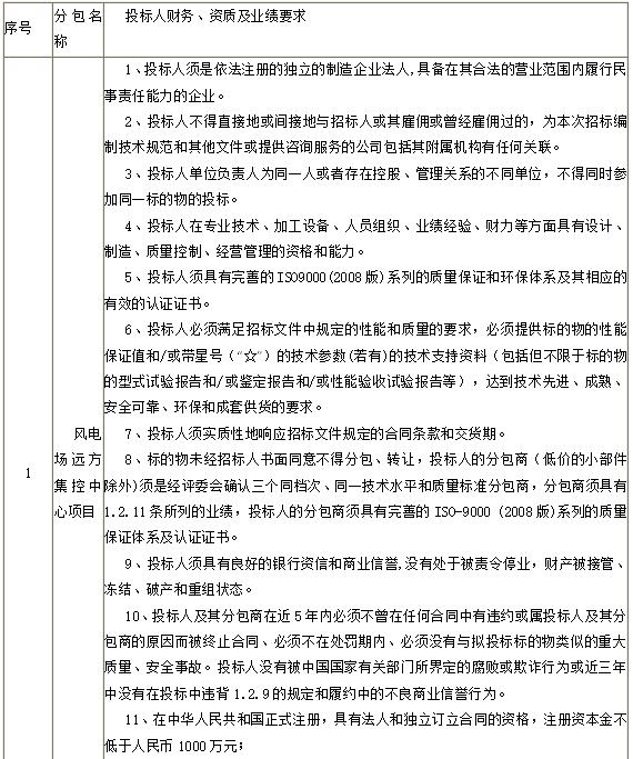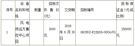 1.4 国电电力广东新能源开发有限公司投运、在建及近期规划的风电场集控中心监控系统全部设备和服务。本次招标范围主要包括:风电场远程集中监控系统工程的调研分析、总体设计、应用开发、设备供货、设备安装、设备调试、系统实施、集成优化、测试、技术服务、后期培训等工作;完成远程集中监控中心集控室装修及机房建设;具体招标范围详见技术规范。