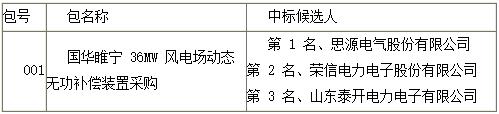 中国神华国际工程有限公司,就国华睢宁 36MW 风电场动态无功补偿装置采购进行公开招标,按规定程序进行了评标、定标,现就本次招标的中标候选人公示如下: