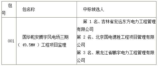 中国神华国际工程有限公司,就国华乾安腾字风电场三期( 49.5MW )工程项目监理进行公开招标,按规定程序进行了评标、定标,现就本次招标的中标候选人公示如下: