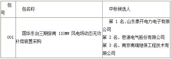 中国神华国际工程有限公司,就国华东台三期弶南 110MW 风电场动态无功补偿装置采购进行公开招标,按规定程序进行了评标、定标,现就本次招标的中标候选人公示如下: