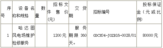 1.4 招标范围为本次招标项目的供货和服务:哈达图风电场设备、系统、设施为期一年的维护检修服务。包括:风力发电机组及其附属设备、箱变、35kV集电线路、发变电设备、风机监控系统、升压站监控系统、通讯及信息传输设备、保护装置、直流系统等设备及系统、电源箱及生活水系统、消防系统、升压站及其附属设备设施的维修、日常维护及卫生清扫、消缺等工作。同时也包括所有必要的材料、备品备件、专用工具、消耗品以及设计、培训、工厂检验、调试以及安装和试运行的指导等技术服务(以下简称“服务”)等。具体内容详见招标文件第二卷的有关规定。按照本招标范围及内容本次招标要求总报价为(一年)。