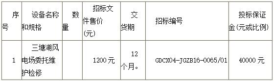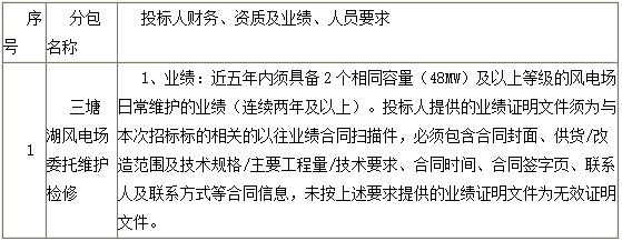 1.4 招标范围为本次招标项目的供货和服务:三塘湖风电场设备、系统、设施为期一年的检修维护服务。包括:一期风机检修维护,110kV升压站检修维护,六条集电线路检修维护,整体风电场设备(一期、二期)点检工作及检修管理工作。同时也包括所有必要的材料、备品备件、专用工具、消耗品以及设计、培训、工厂检验、调试以及安装和试运行的指导等技术服务(以下简称“服务”)等。具体内容详见招标文件第二卷的有关规定。按照本招标范围及内容本次招标要求总报价为(一年)。