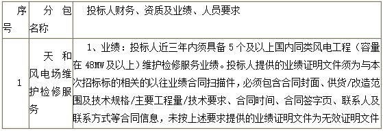 1.4 招标范围为本次招标项目的供货和服务:天和风电场设备、系统、设施为期一年的维护检修服务。包括:风力发电机组及其附属设备、箱变、35kV集电线路、发变电设备、风机监控系统、升压站监控系统、通讯及信息传输设备、保护装置、直流系统等设备及系统、电源箱及生活水系统、消防系统、升压站及其附属设备设施的维修、日常维护及卫生清扫、消缺等工作。同时也包括所有必要的材料、备品备件、专用工具、消耗品以及设计、培训、工厂检验、调试以及安装和试运行的指导等技术服务(以下简称“服务”)等。具体内容详见招标文件第二卷的有关规定。按照本招标范围及内容本次招标要求总报价为(一年)。