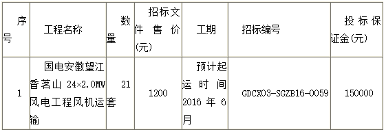 本招标项目国电安徽望江香茗山24×2.0MW风电工程风机运输项目,项目公司为国电电安徽公司,建设资金来自企业自筹,项目出资比例为招标人100%,招标人为国电联合动力技术有限公司。项目已具备招标条件,现对该项目的服务进行公开招标。