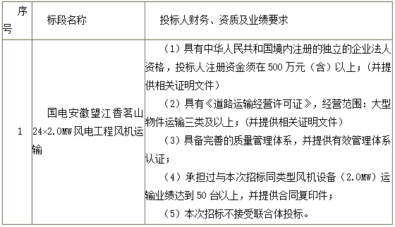 招标范围:国电联合动力技术有限公司国电安徽望江香茗山24×2.0MW风电工程风机运输