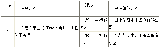 北京国电工程招标有限公司,受大唐大丰三龙风电项目筹建处的委托就如下标段进行了国内公开招标,已完成评标工作,现将结果公示如下: