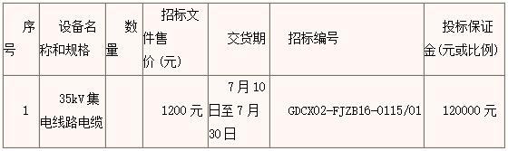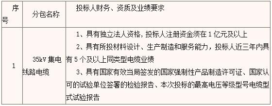 1.4 招标范围为国电和风黑山塘坊风电项目35kV集电线路及风机低压侧电缆,包括ZRC-YJXLHV22-35kV-3×95mm2、ZRC-YJXLHV22-35kV-3×240mm2、ZRC-YJLHV22-1kV-3×400mm2+1×185mm2、ZRC-YJLHV22-1kV-5×70mm2共4种型号电缆、铜铝过渡接线端子、专用工具、运输、保险、技术资料以及有关的技术服务等。