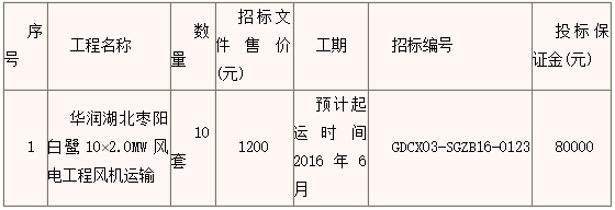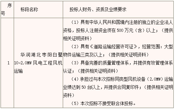 招标范围:国电联合动力技术有限公司华润湖北枣阳白鹭10×2.0MW风电工程风机运输