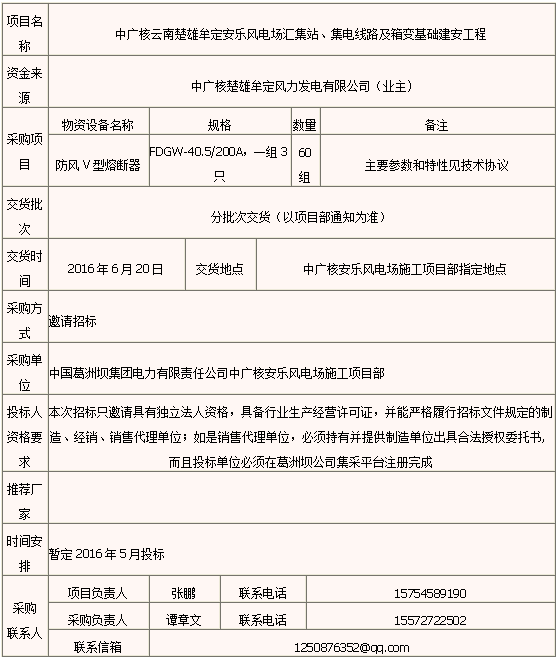 电力公司新能源二公司中广核云南楚雄牟定安乐风电场熔断器采购预告