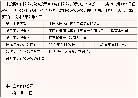 国投东川风电场二期48MW工程风电场设备安装及线路施工工程中标候选人公示