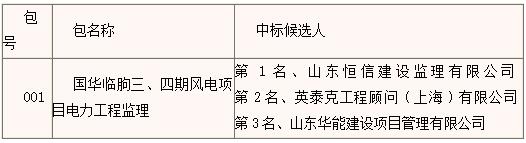 中国神华国际工程有限公司,就国华临朐三、四期风电项目电力工程监理进行公开招标,按规定程序进行了评标、定标,现就本次招标的中标候选人公示如下: