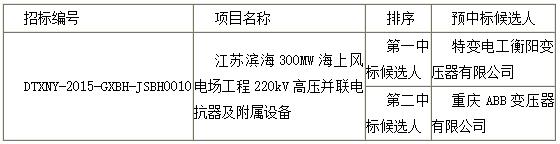 (清洁能源部)-江苏滨海300MW海上风电场工程220kV高压并联电抗器及附属设备中标公示