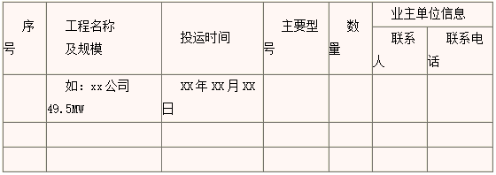 3、投标产品的生产企业具有设计、制造与招标设备相同/相近设备的能力,提供的业绩必须是真实的,如发现虚假业绩,将取消其投标资格,且业绩格式要符合下表的要求(可增加栏目),否则视为无效业绩。