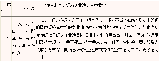 1.4 招标范围为为大风丫口、马英山风电场及配套升压站、送出线路设备、系统、设施为期一年的检修、维护服务等。具体内容详见招标文件第二卷的有关规定。。按照本招标范围及内容本次招标要求总报价为(一年)。