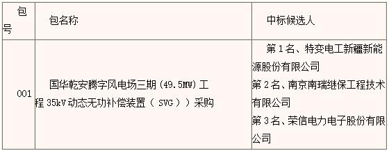 中国神华国际工程有限公司,就国华乾安腾字风电场三期 (49.5MW) 工程 35kV 动态无功补偿装置( SVG ))采购进行公开招标,按规定程序进行了评标、定标,现就本次招标的中标候选人公示如下: