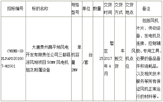 招标代理:北京国电工程招标有限公司 招 标 人:中国水利电力物资集团有限公司 最终用户:大唐贵州新能源开发有限公司 招标编号:CWEME-SDXLFAFD201607-WZ001 项目所属行业:能源 招标类型:物资招标 标讯类别:国内招标 招标主题:大唐贵州新能源开发有限公司三都县凉风坳项目50MW风电机组及附属设备 资金来源:自筹资金 所属地区:贵州省