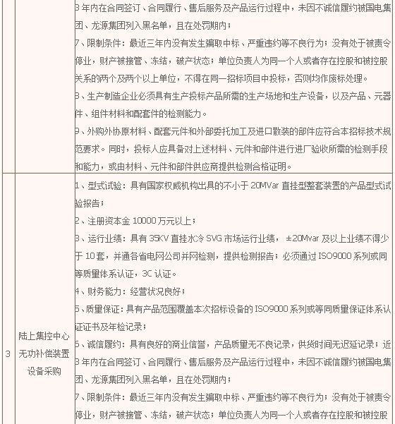 包3:根据国家相关规范以及发包方要求,完成陆上集控中心无功补偿装置设备设计、生产、供货、运输、交货、指导安装、调试、质量保证(通过验收后2年)等相关工作内容,具体为:±24MVar水冷直挂型无功补偿装置设备2套。详见技术文件要求,供货期暂定于2016年11月份供货,具体根据招标人要求。