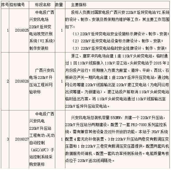 中电投南方公司桂林分公司受招标人委托,对中电投广西兴安风电场220kV坵坪变电站视觉识别系统(VI系统)制作安装标、广西兴安风电场220kV升压站工程并网验收标、中电投广西兴安风电220kV升压站工程有功、无功自动控制(AGC/AVC)子站控制系统采购安装标,等3个标段进行公开招标。