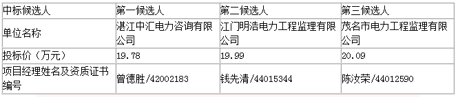 湛江110千伏调风风电场接入系统工程、湛江110千伏凤山风电场接入系统工程监理[项目编号:JG2016-4908]项目的招标评标工作已经结束,评标委员会经评审推荐了本项目中标候选人。 现将中标候选人情况予以公示(公示时间从2016-07-29 00:00至 2016-08-01 23:59止),具体如下: