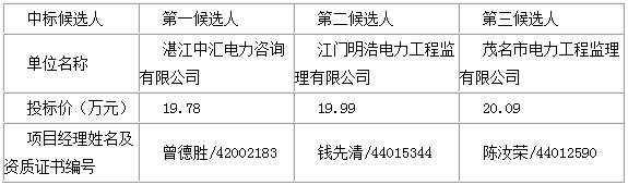 湛江110千伏调风风电场接入系统工程、湛江110千伏凤山风电场接入系统工程监理[项目编号:JG2016-4908]项目的招标评标工作已经结束,评标委员会经评审推荐了本项目中标候选人。 现将中标候选人情况予以公示(公示时间从2016-07-29 00:00 至 2016-08-01 23:59止),具体如下: