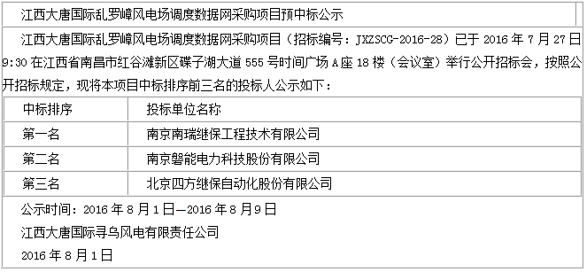 江西大唐国际乱罗嶂风电场调度数据网采购项目预中标公示