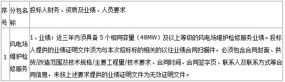1.4 招标范围为本次招标项目的服务:本次招标的范围为青龙风电场设备、系统、设施的检修维护服务。包括:风力发电机组及其附属设备、箱变、35kV集电线路、发变电设备、风机监控系统、升压站监控系统、通讯及信息传输设备、保护装置、直流系统等设备及系统、电源箱及生活水系统、消防系统、升压站及其附属设备设施的维修、日常维护及卫生清扫、消缺等工作等。具体内容详见招标文件第二卷的有关规定。按照本招标范围及内容本次招标要求总报价为(一年)。
