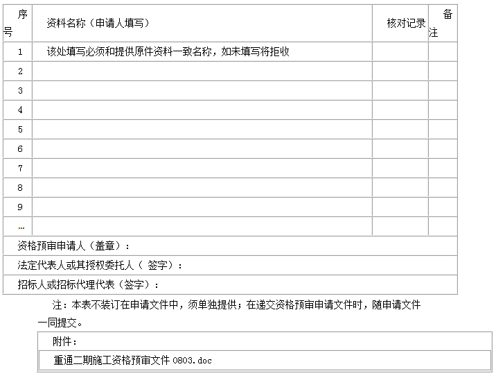 ③资格预审申请文件中所需提供的复印件必须提供原件核查,核查原件必须按本公告规定带至资审现场与资格预审申请文件同时提交,未能提供原件或原件不全者,招标人有权拒绝接受其资格预审申请文件。