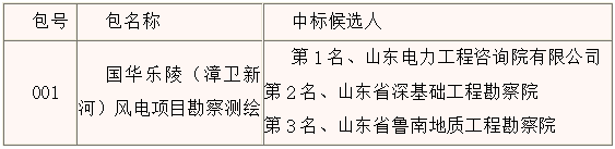 中国神华国际工程有限公司,就国华乐陵(漳卫新河)风电项目勘察测绘进行公开招标,按规定程序进行了评标、定标,现就本次招标的中标候选人公示如下:
