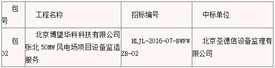 北京博望华科科技有限公司张北50MW风电场服务项目(招标编号为:HLJL-2016-07-BWFWZB-02)评标工作已经结束。现依据《中华人民共和国招标投标法实施条例》第五十三条和第五十四条的规定,现将评标委员会推荐中标候选人予以公示,公示期为3天。投标人或者其他利害关系人对依法必须进行招标的项目的评标结果有异议的,应当在中标候选人公示期间以书面形式(传真)向招标代理机构提出。