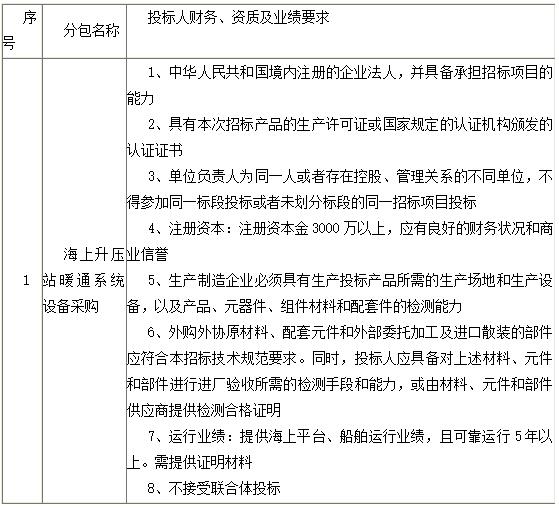 1.5 本次招标项目招标范围如下:根据国家相关规范及发包方要求,完成海上升压站暖通系统设备(包含但不限于单元式空调及新风除湿机等通风空调系统设备)的设计、生产、供货、运输、交货、指导安装、调试、质量保证(通过验收后8年)。详见技术文件要求,质保期8年,交货日期暂定2017年3月份供货,具体根据招标人要求。