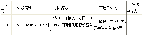 华润电力2016年度集中第13批招标(新能源-九江桃源二期风电35kV环网柜)招标通过招标评审,结果公示如下:
