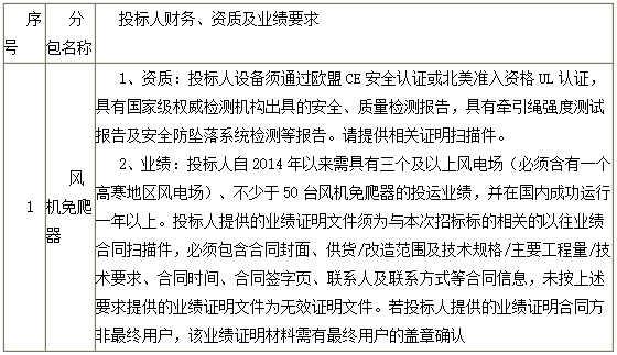 1.4 招标范围为使用适合国电电力宁波穿山风电场选用的WD77-1500S风机免爬器技术,包括免爬器的设计、结构、性能、制造、安装等方面的要求。投标人应提供与设备有关的安装、试验、维护和检修等工作相应的技术指导、技术配合、技术培训等全过程的服务。并将原有30台风机助爬器拆除运输至指定地点等。具体内容详见招标文件第二卷的有关规定。