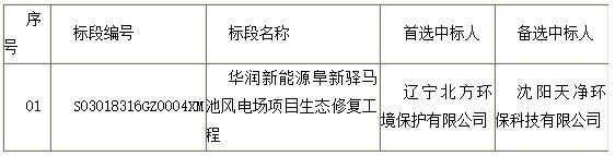 华润电力东北大区第2批招标(阜新驿马池风电场生态修复)通过招标评审,结果公示如下: