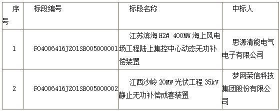 国家电力投资集团公司物资装备分公司2016年度第五批无功补偿集中招标(江苏滨海H2#海上风电、江西沙岭20MW光伏工程)招标结果公告
