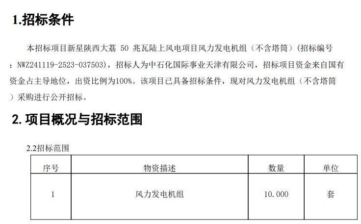 中石化国际事业天津有限公司新星陕西大荔 50 兆瓦陆上风电项目风力发电机组(不含塔筒)评标结果公示