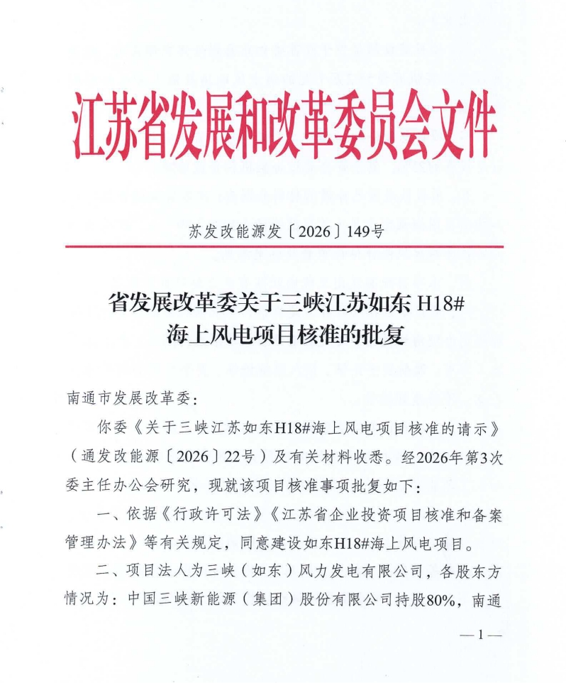 近日,江苏国信东台H4#/H6#海上风电项目、三峡江苏如东H18#海上风电项目分别取得核准批复。