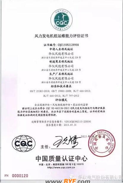 2015年8月10日,中国质量认证中心向华仪风能有限公司颁发了《风力发电机组运维能力评估证书》。该项证书的获得证明华仪风能有限公司风力发电机组运维管理、定期维护、故障处理和大部件检修服务能力符合《风力发电机组维护能力评估技术规范》要求。
