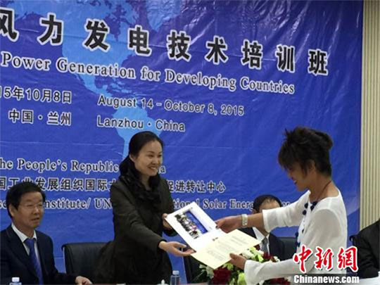 10月8日,由中国商务部主办、甘肃自然能源研究所承办的2015发展中国家风力发电技术培训班在兰州结业。图为承办方向学员颁发结业证书。