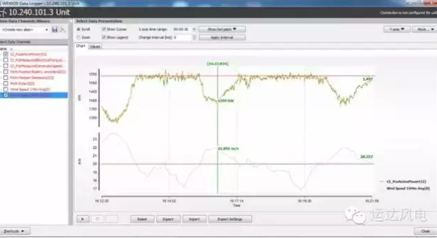 数据解读:从上述运行截图中,可以很明显看出,在风速超过20m/s后,机组可以降低功率运行。