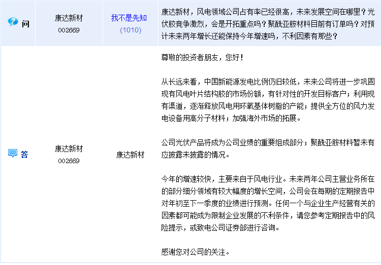 康达新材周一在全景网互动平台上回答投资者提问时表示,从长远来看,中国新能源发电比例仍旧较低,未来公司将进一步巩固现有风电叶片结构胶的市场份额,有针对性的开发目标客户;利用现有渠道,逐渐释放风电用环氧基体树脂的产能;