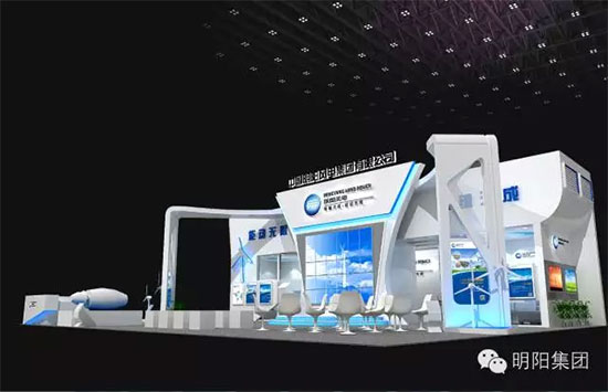 本次展台采用自身蓝白色调搭配,表达了明阳风电一直以“发展绿色能源,造福人类社会”为使命。此外,展台整体结构利用两侧立柱与中部舞台相互配合形成拟怀抱式视觉效果,表达了明阳风电广迎五湖四海宾客的热情。