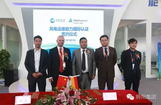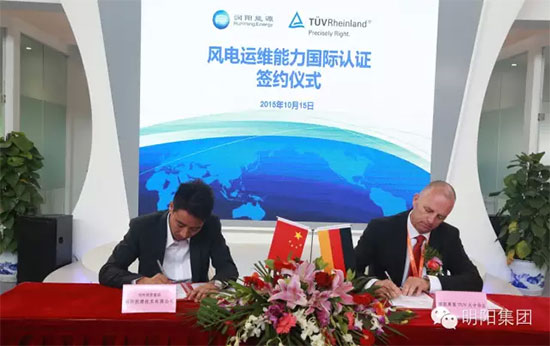 10月15日上午,明阳集团旗下控股子公司润阳能源与TUV-莱茵签订风电运维能力国际认证协议,润阳能源总经理樊浩杰与TUV-莱茵全球业务经理Frank Witte先生分别在协议上签字,润阳能源董事长金云山出席签约仪式。