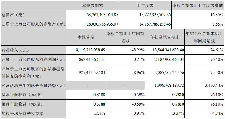 2、1-9月,公司实现归属于上市公司股东的净利润为人民币862,445,621.11元,较去年同期增加76.40%。