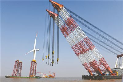 响水近海两百兆瓦风电场示范项目近日正在安装,这是我国第一个经海上向陆地送电的风电工程。图为作业船做好整体风机吊装准备。