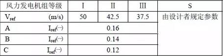 请注意,Vref是指风电场50年一遇的10分钟最大风速;Iref是指15m/s时的湍流强度的平均值;A是指高湍流强度等级,B是指中等湍流等级,C是指低等湍流强度。
