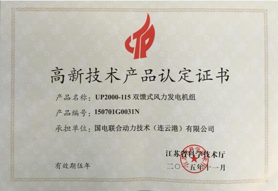 2月3日获悉,由联合动力自主研发的UP2000-115双馈式风力发电机组,荣获江苏省高新技术产品认证,证书编号为:150701G0031N。